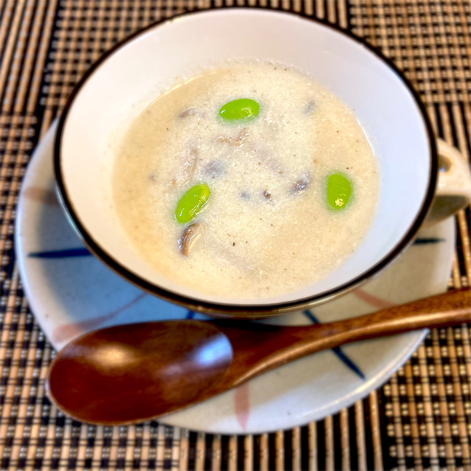『枝豆とキノコの濃厚豆乳スープ』